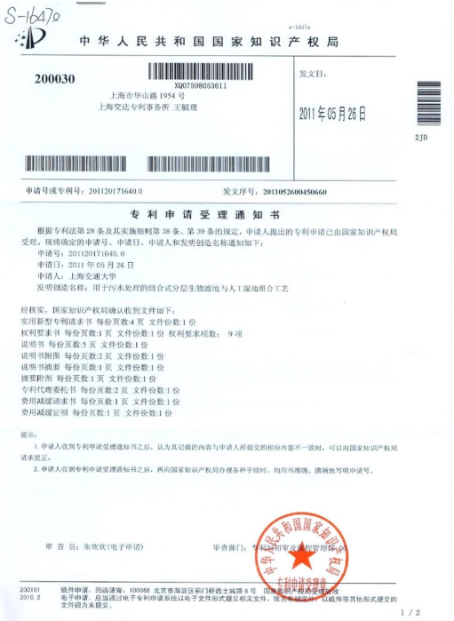 复合滤料强化了系统的处理效果;有机物容积负荷可高达2 kg/m³•d;对生活污水而言,组合处理出水可达到国家一级标准(GB18918-2002)。